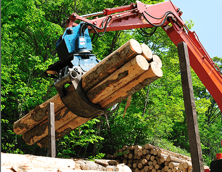 伐採(収穫)した丸太は、ケーブルなどで吊るして山から林道まで運び出されたり、ウインチで引っ張ったりして搬出されます。積みおろし機などで集めてトラックに積み込まれ、原木市場や貯木場へ運ばれます。原木市場や貯木場へ運ばれた木材は競りで製材業者に買われます。また、直接製材工場に運搬される場合もあります。